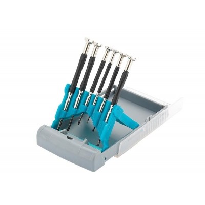 O conjunto de chaves de precisao profissional da marca GROSS destina-se a aparafusar e desaparafusar ligacoes roscadas pequenas. Chaves de fenda deste tamanho sao indispensaveis quando se trabalha com eletronica, relogios, etc. Os nucleos das chaves de fenda sao feitos de aco cromo-molibdenio de alta qualidade (CrMo). Pontas de chave de fenda sao revestidas com um revestimento resistente a corrosao duravel. O punho emborrachado ergonomico senta-se confortavelmente em sua mao e permite que voce manipule detalhes finos com precisao. O lado de tras da chave de fenda e equipado com uma arruela giratoria. Embalado em uma caixa de plastica termoformada (blister duplo).